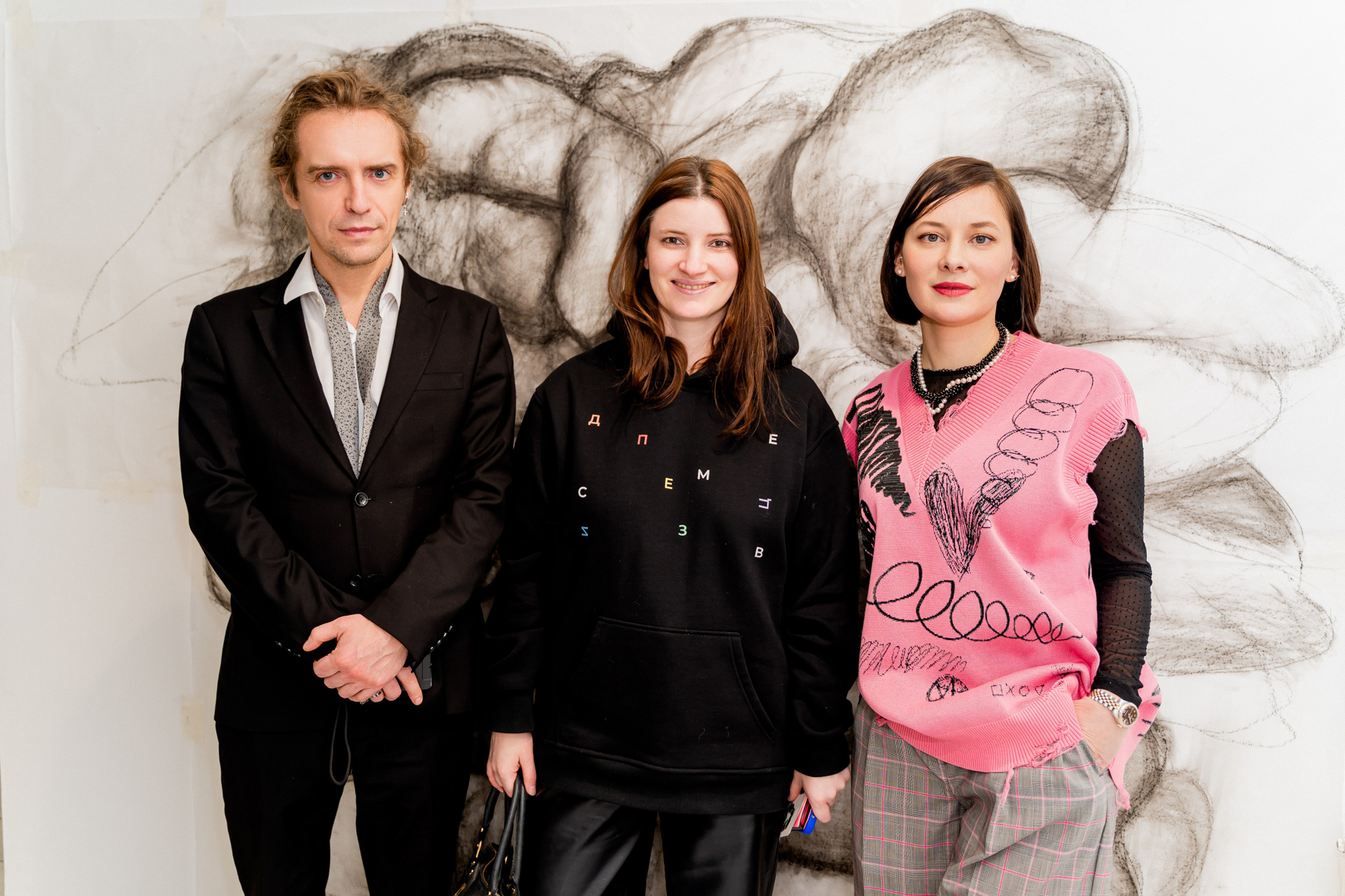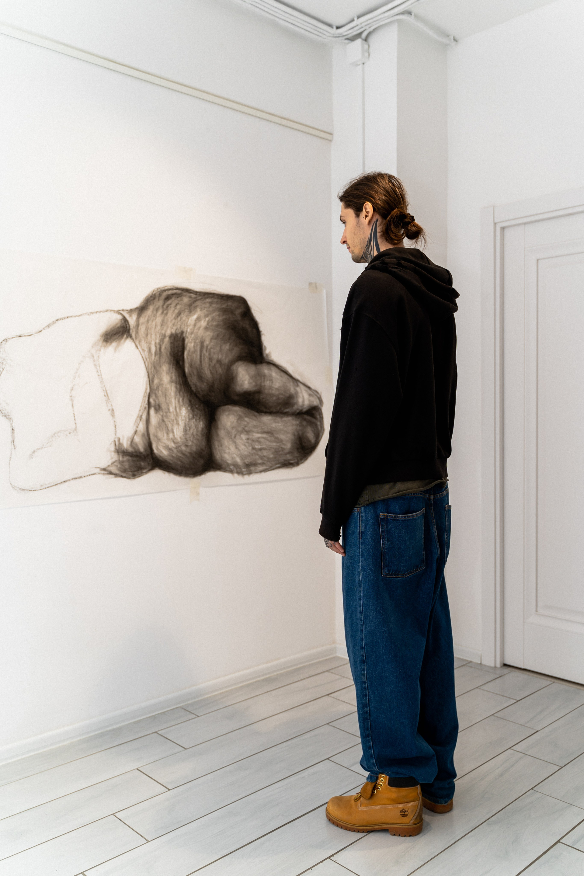 Проект также включает графические фрески на бумаге, где жесткие структурные элементы сталкиваются с телесными отпечатками, продолжая тему внутреннего напряжения между формой и ее распадом.